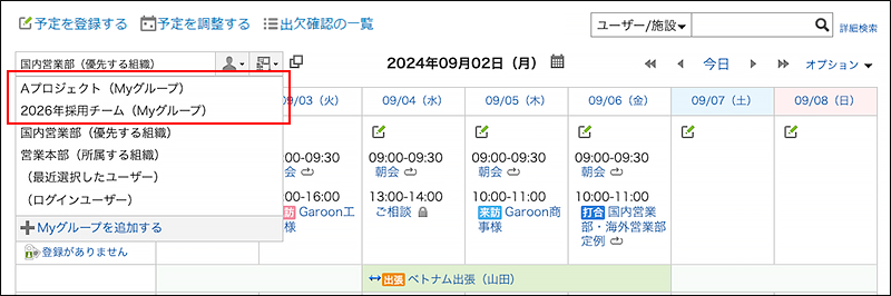 また、Myグループを設定しておくと、所属組織を横断するプロジェクトや、業務で頻繁に関わるユーザーのスケジュールを、すばやく簡単に確認できます。