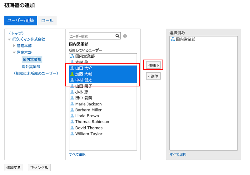 7. 「初期値の追加」画面で、共有先の初期値に設定するユーザー、組織、またはロールを選択し、[候補]をクリックします。 候補ボタンが赤枠で囲まれている画像