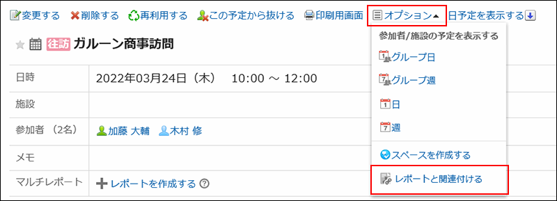 「予定の詳細」画面で、[オプション]の[レポートと関連付ける]をクリックすると、作成済みのレポートを予定に関連付けることができます。