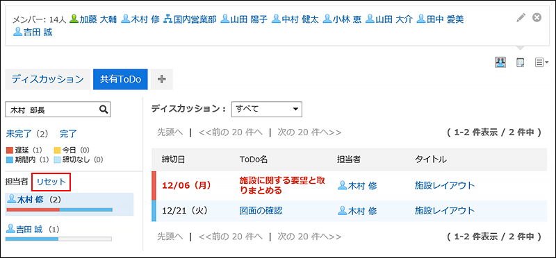 「共有ToDo」画面で、担当者一覧に表示されている担当者を絞り込みます。