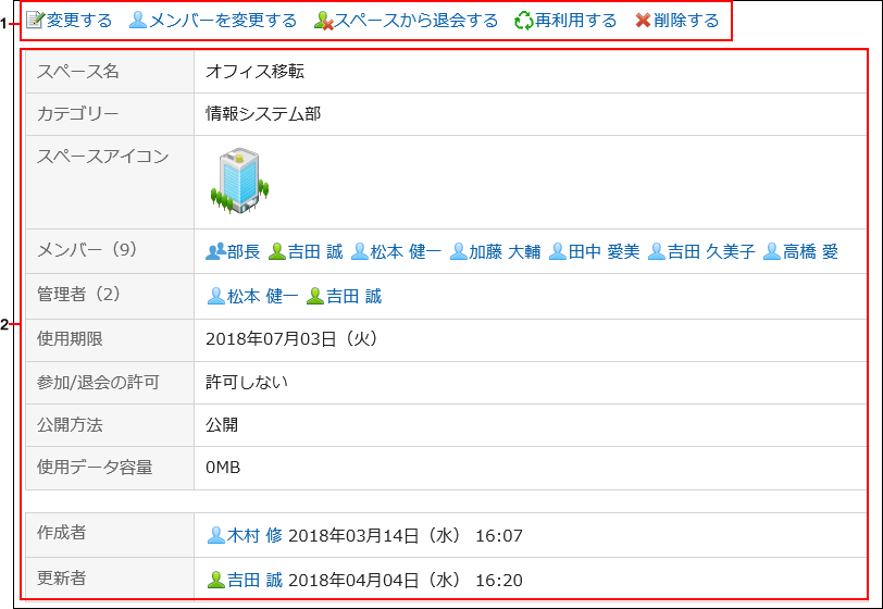 1:スペースの管理者が設定されている場合、このリンクはシステム管理者とスペースの管理者だけに表示されます。スペースの管理者が設定されていない場合、メンバー全員とシステム管理者に表示されます。