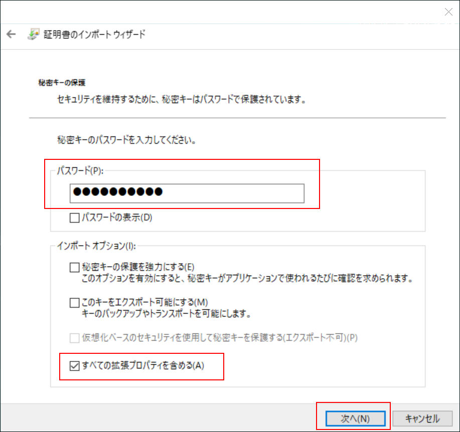 ファイル名に、インストールするクライアント証明書が表示されていることを確認し、[次へ]をクリックします。