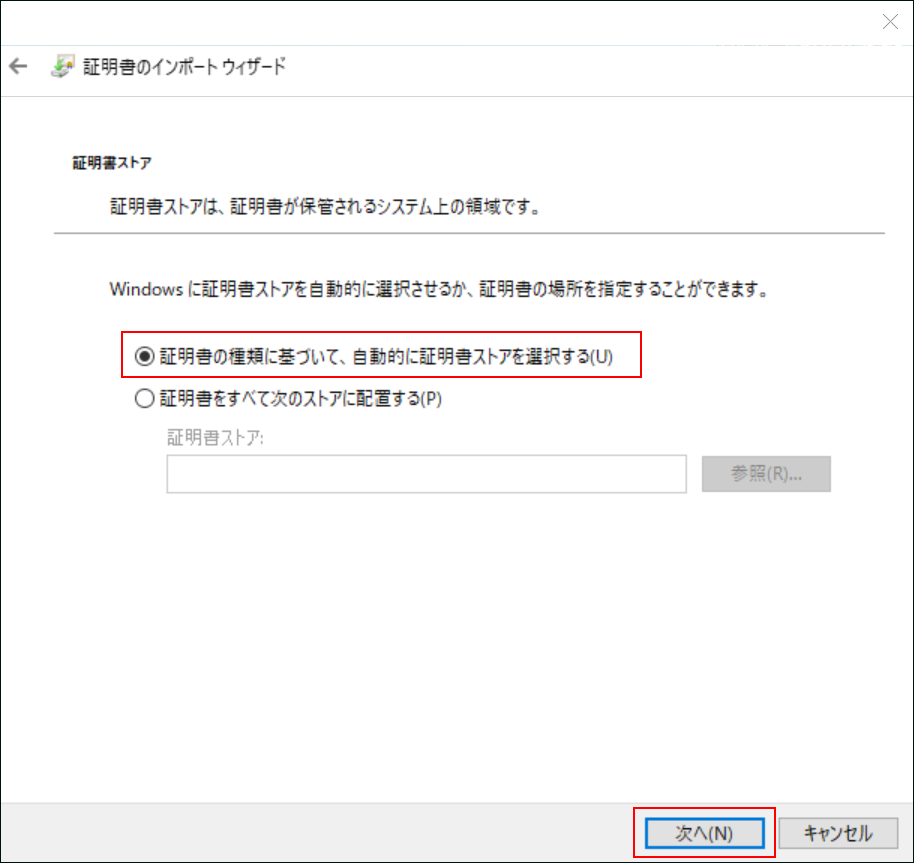 「証明書の種類に基づいて、自動的に証明書ストアを選択する」を選択し、[次へ]をクリックします。