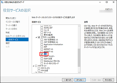 「役割サービスの選択」画面で、「Webサーバー」の左横の