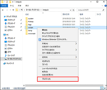 Windowsのエクスプローラーで、C:\inetpubフォルダーを開きます。