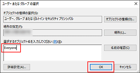 「ユーザーまたはグループの選択」画面で、「Everyone」と入力し、 [OK]をクリックします。