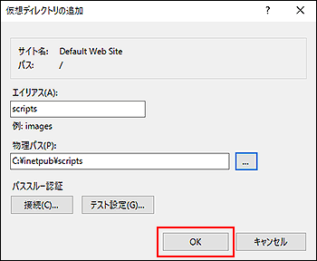 「仮想ディレクトリーの追加」画面で、[OK]をクリックします。