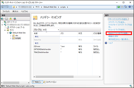 左ペインで、仮想ディレクトリーのscriptsを選択し、[ハンドラーマッピング]をダブルクリックします。