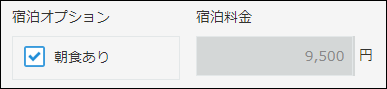 「宿泊オプション」フィールドで「朝食あり」が選択されている場合は、宿泊料金8,000円に朝食代1,500円を足した料金を表示します。選択されていない場合は、宿泊料金8,000円をそのまま表示します。