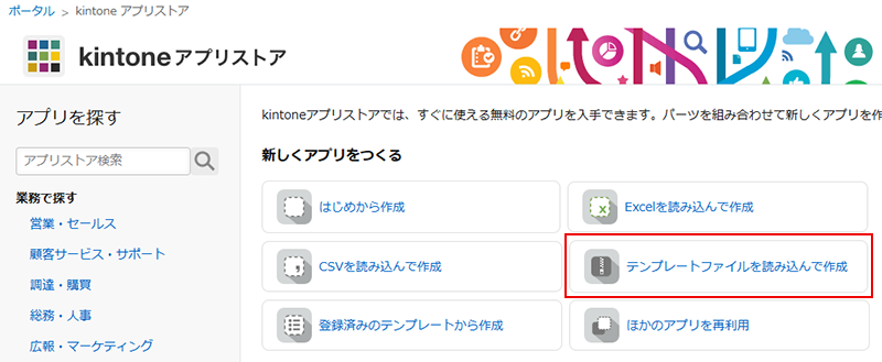[kintoneアプリストア]画面で、[テンプレートファイルを読み込んで作成]をクリックします。