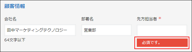 エラーの下に、入力内容の修正が必要なフィールド名(項目名)が表示されます。