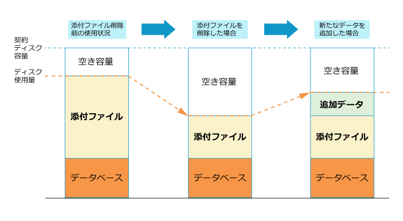 添付ファイルを削除すると、その分だけディスク使用量が減り、新たなデータを追加したときに空き容量を使用できます。