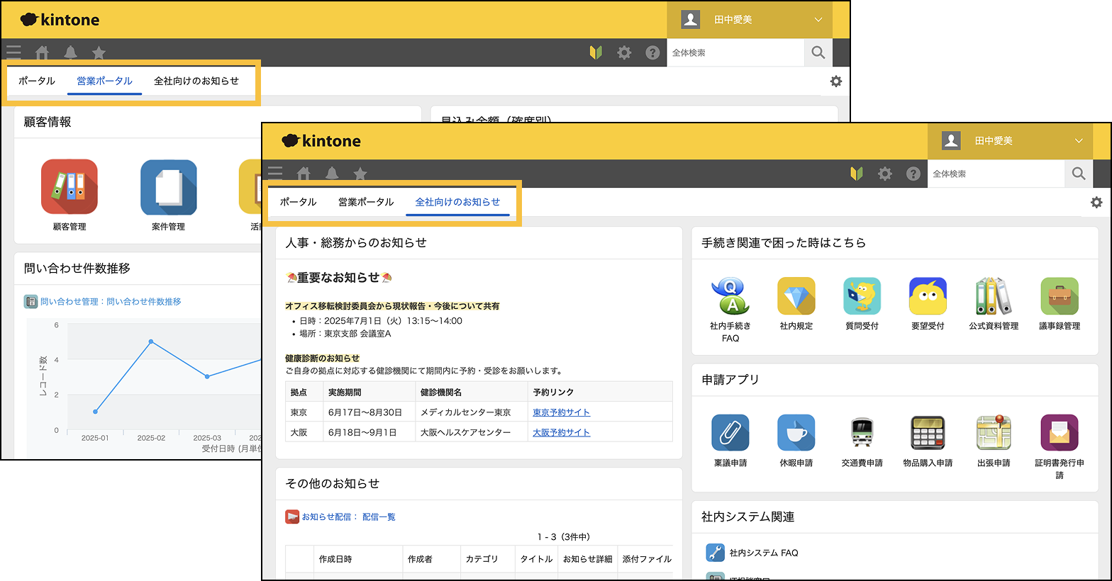 kintoneシステム管理者が、従来より提供していたポータルとは別に、2枚目以降のポータルを新たに作成できるようになりました。そのほか、複数のキーワードでアプリを検索できるようになる対応などを行っています。