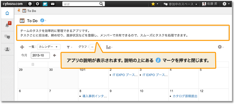 「一般設定」でアプリの説明を記載している場合、そのアプリの一覧画面で自動的に説明を表示します。アプリの使い方や運用ルールなどを、他のメンバーに告知しやすくなります。
