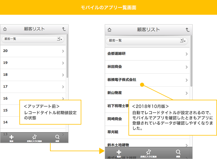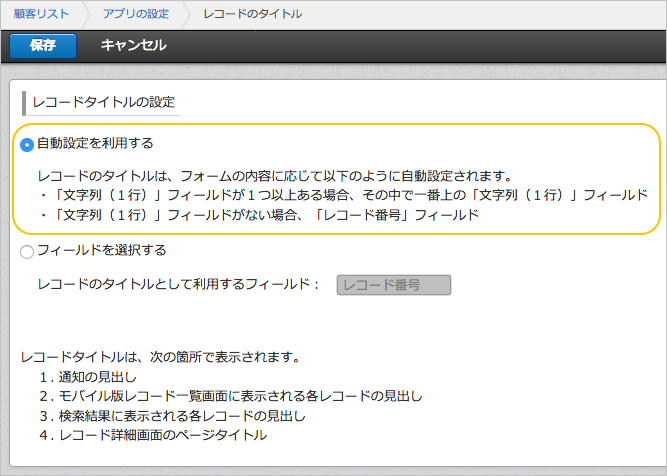 ※ レコードタイトルの設定とは通知の見出しやモバイルでのレコード一覧などレコードの見出しとして使われる設定です。