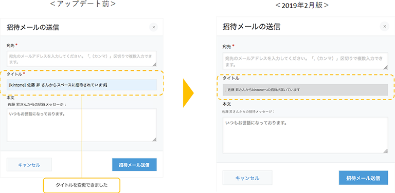 kintoneのゲストユーザーの招待メールであることがよりわかりやすくなるよう表現を変更して タイトルを固定にしました。