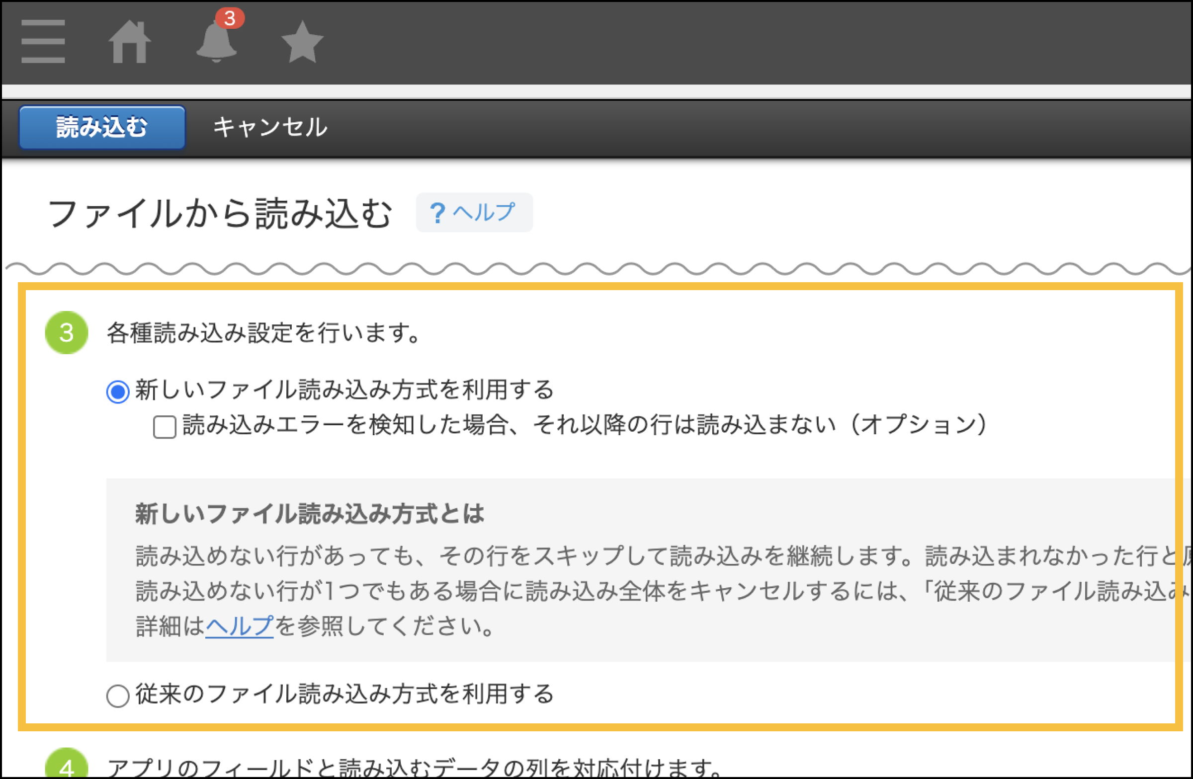 読み込むファイルの行の順番を維持してアプリへの読み込みを行いたい場合、「新しいファイル読み込み方式」の「読み込みエラーを検知した場合、それ以降の行は読み込まない」オプションを利用できます。このオプションを利用すると、エラー行を検知した時点で読み込みが中止され、そのエラー行以降の行は読み込まれません。
