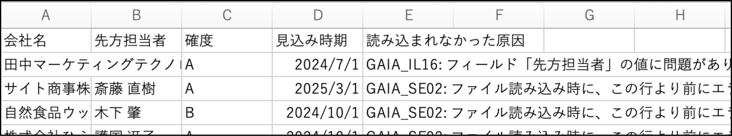 読み込みに失敗した行がある場合、CSVのダウンロードリンクが表示されます。CSVには、読み込んだファイルの全行のうち読み込まれなかった行が、発生したエラー内容と共に記載されるため、このCSVファイルをもとに修正し、そのまま再読み込みすることが可能です。