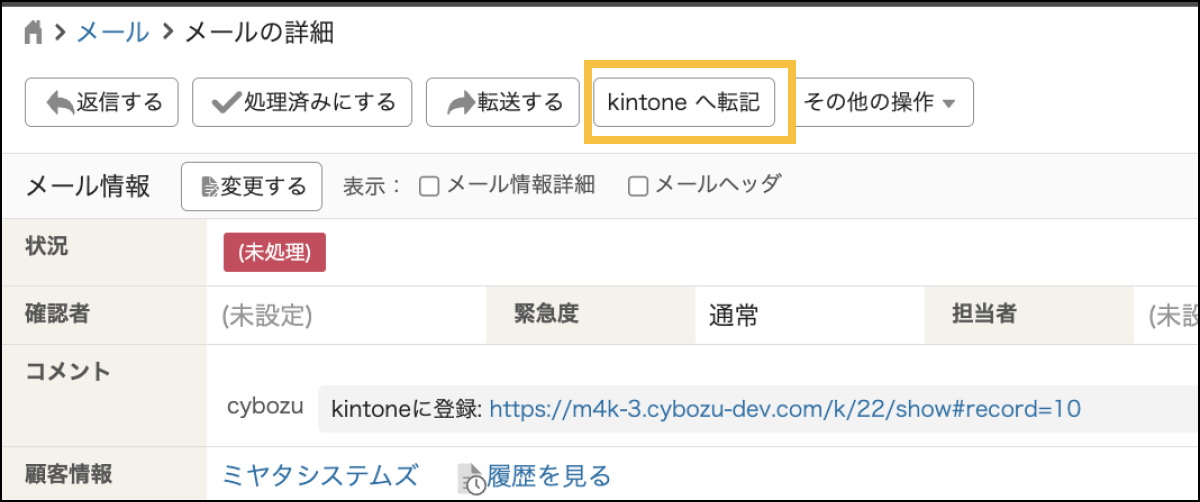 メール対応業務を kintone で管理しやすくするための、kintone アプリとの連携機能を搭載しています。