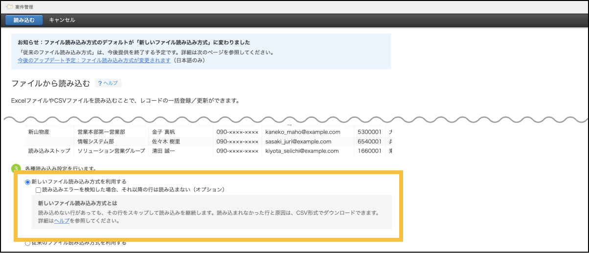 ファイル読み込み画面で、デフォルトで選択される読み込み方式が「新しいファイル読み込み方式」になりました。これまでは、デフォルトで従来のファイル読み込み方式が選択されていました。