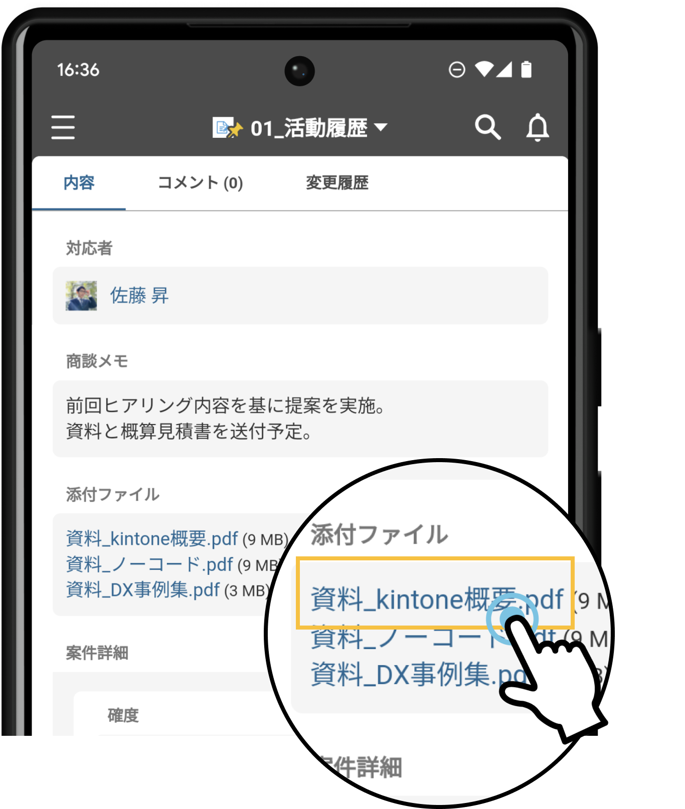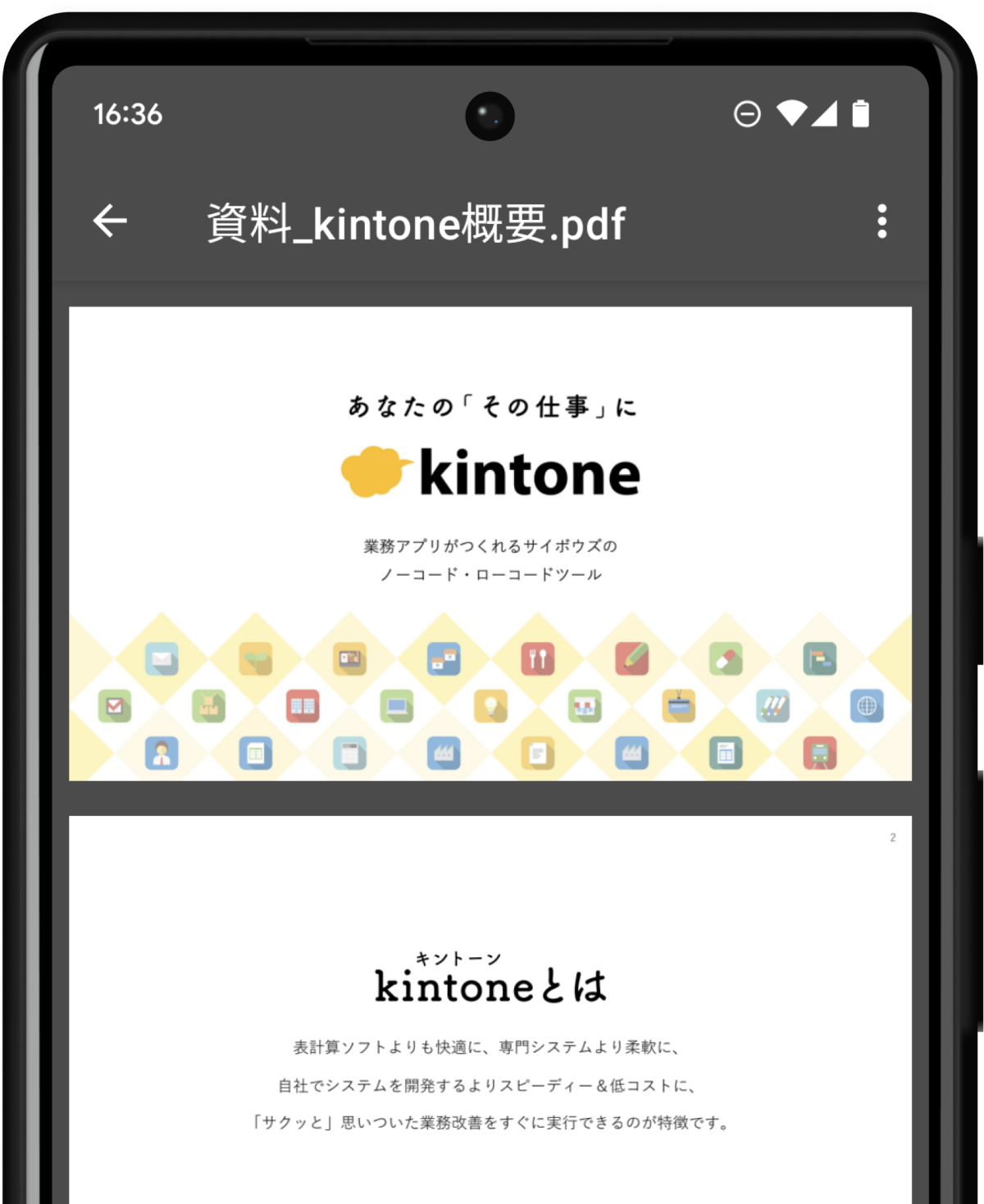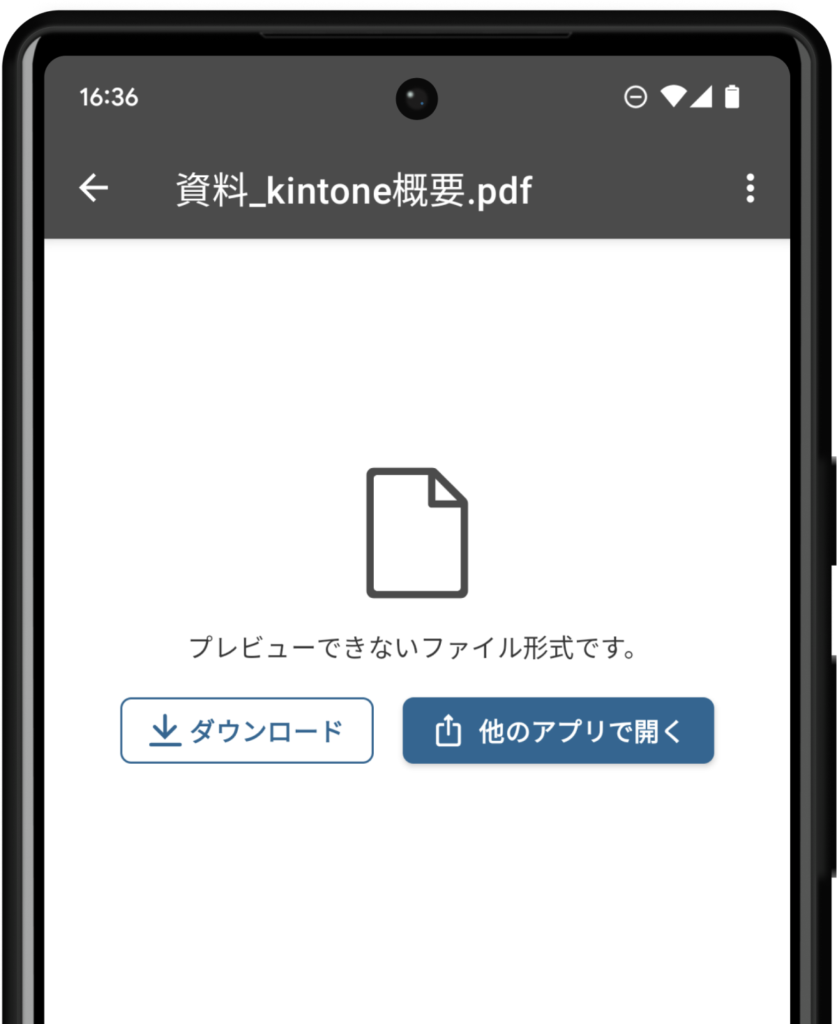 Android版 kintoneモバイルアプリにおいて、レコードに添付されているPDFファイルをプレビュー表示できるようになりました。従来は、PDFファイルの内容を確認する場合、 PDFファイルの閲覧が可能な他のアプリで開き直す必要がありました。今後は、kintoneモバイルアプリ内でスムーズにPDFファイルの内容を確認できるようになります。