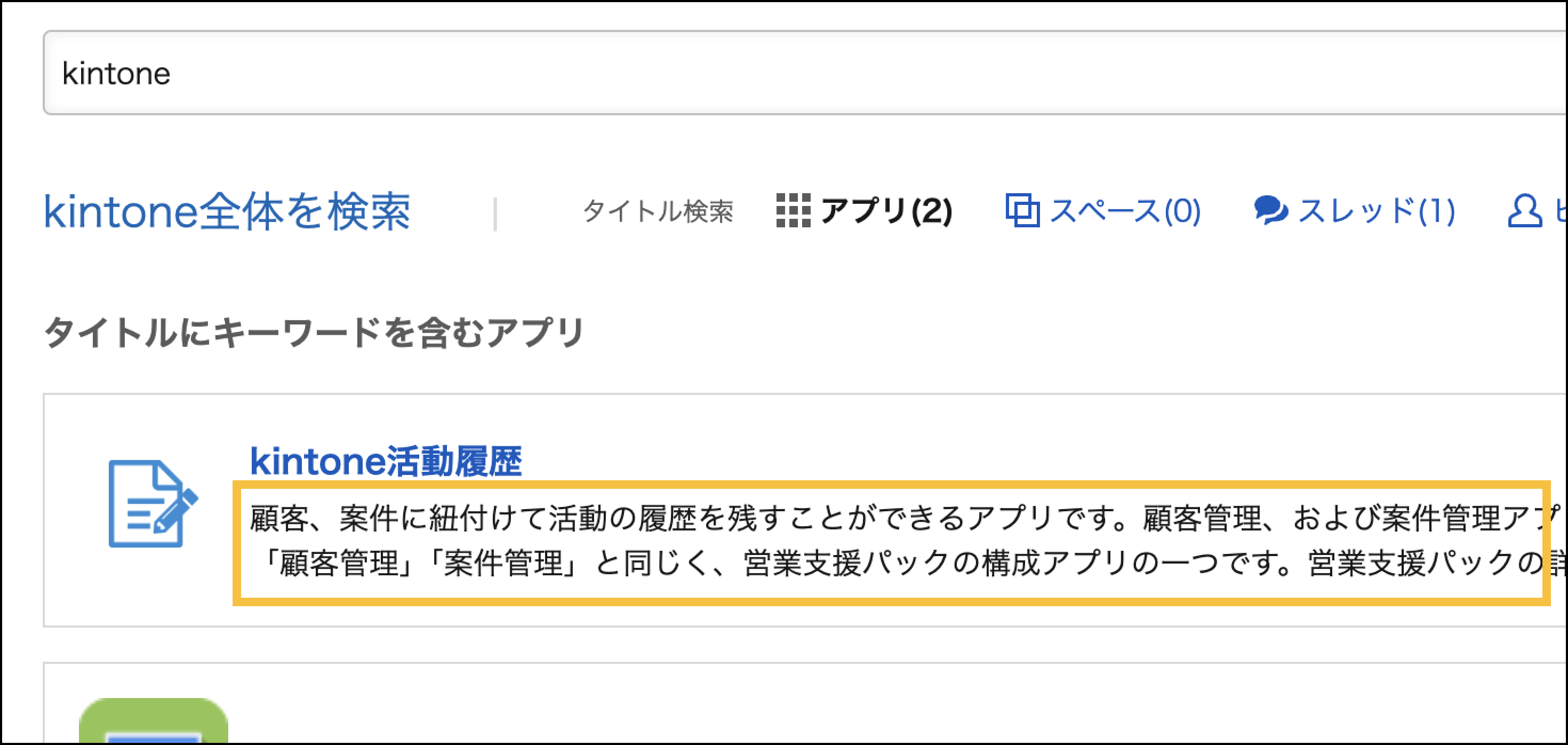 アプリ名やスレッド名だけでなく、アプリの説明や、スレッドが所属するスペース名も確認できます。