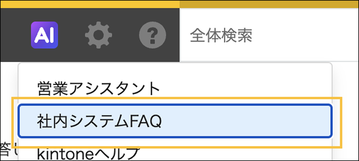 kintone AI管理画面から検索AIの設定画面を開き、チャットボットを設定します。設定ができるのはシステム管理者のみです。