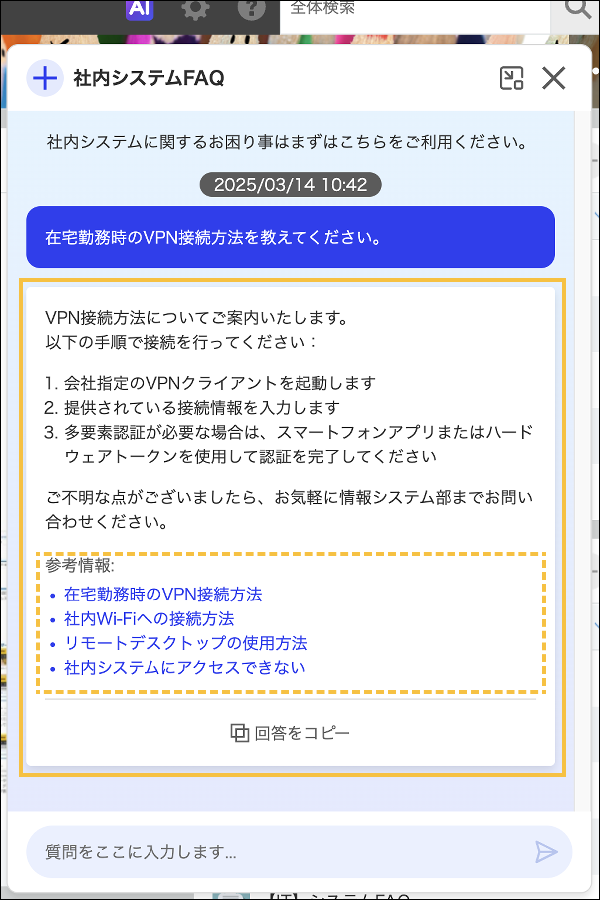 回答生成時に参考にしたレコードリンクが「参考情報」として表示されます。