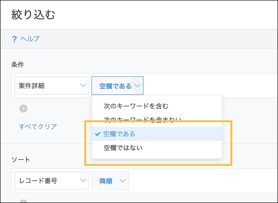 絞り込み条件を設定する箇所で文字列複数行フィールドを選択したとき、「空欄である」「空欄ではない」を選択できるようになります。例えば、「案件詳細」フィールドが空欄のレコードのみを絞り込む、といったことが可能になります。