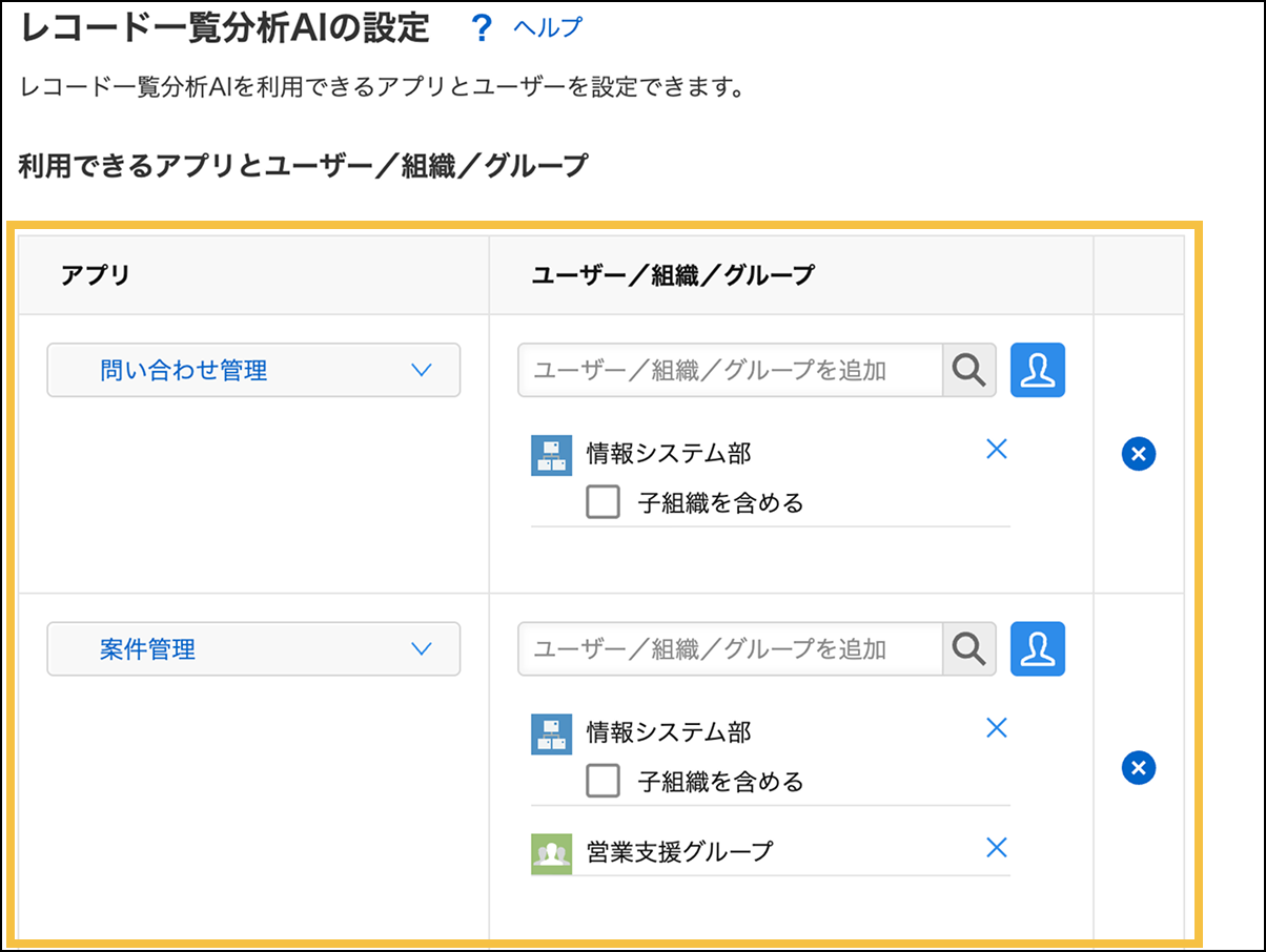 kintone AI管理の設定画面で、このAIの利用を許可するアプリと組織・グループ・ユーザーの組み合わせを指定できます。