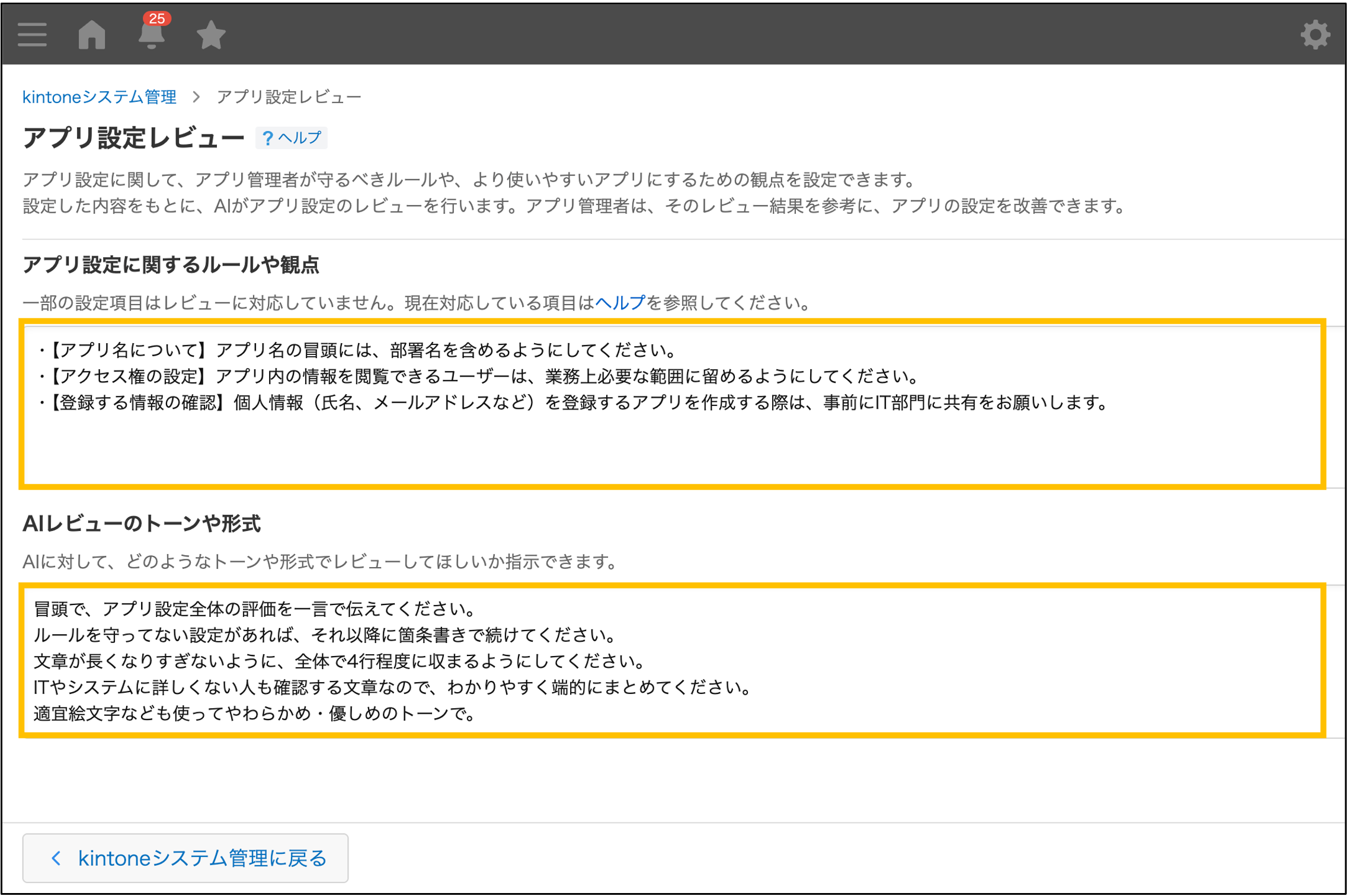 システム管理画面から「アプリ設定レビュー」を開くと、アプリ設定レビューAIの設定を行うことができます。