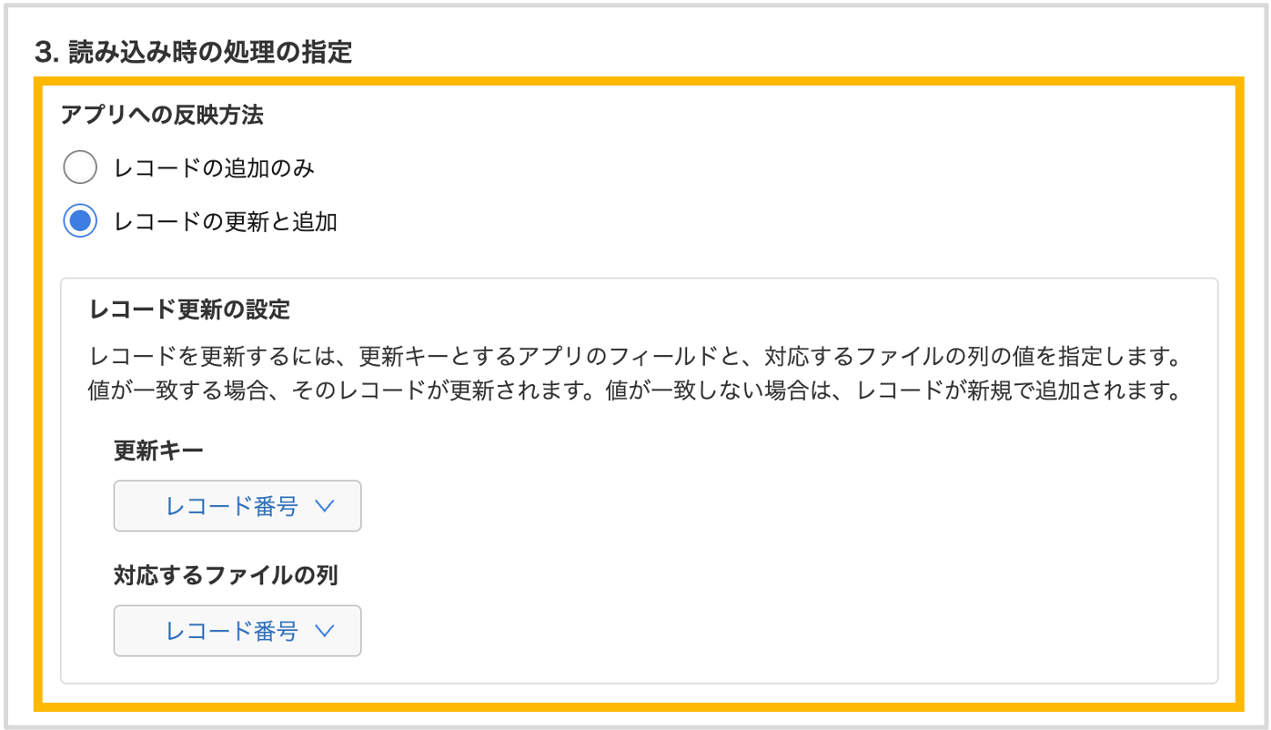 「レコードの更新と追加」を選択した場合にのみ、更新キーとするアプリのフィールドと対応するファイル内の列を指定する設定項目が追加で表示されます。