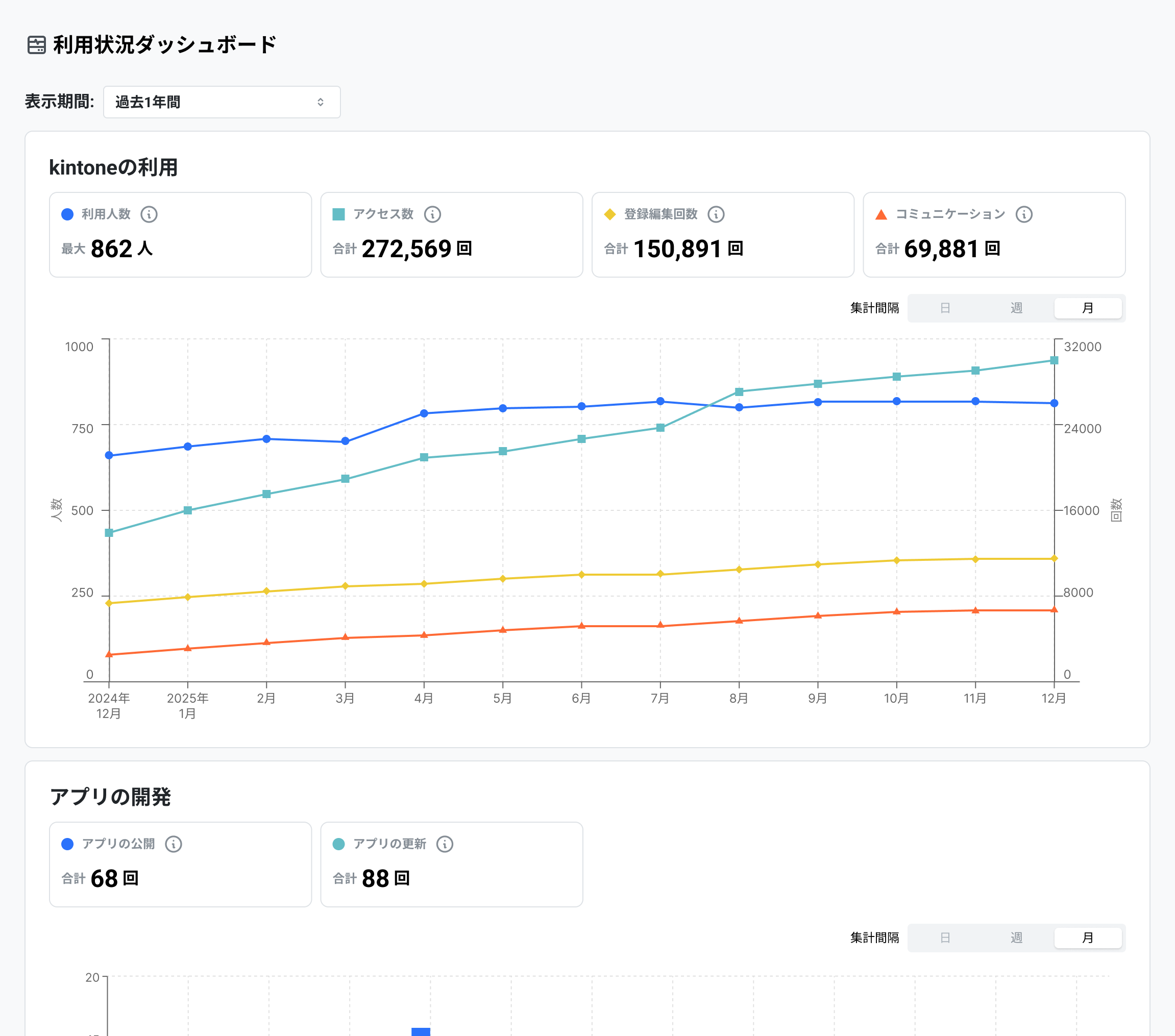 本機能では、利用ユーザー数やアプリへの操作回数などのメトリクスを時系列グラフで表示できます。これにより、kintoneシステム管理者がkintoneの利用状況の推移を把握でき、社内での定着度や情報の共有状況を確認することが可能です。