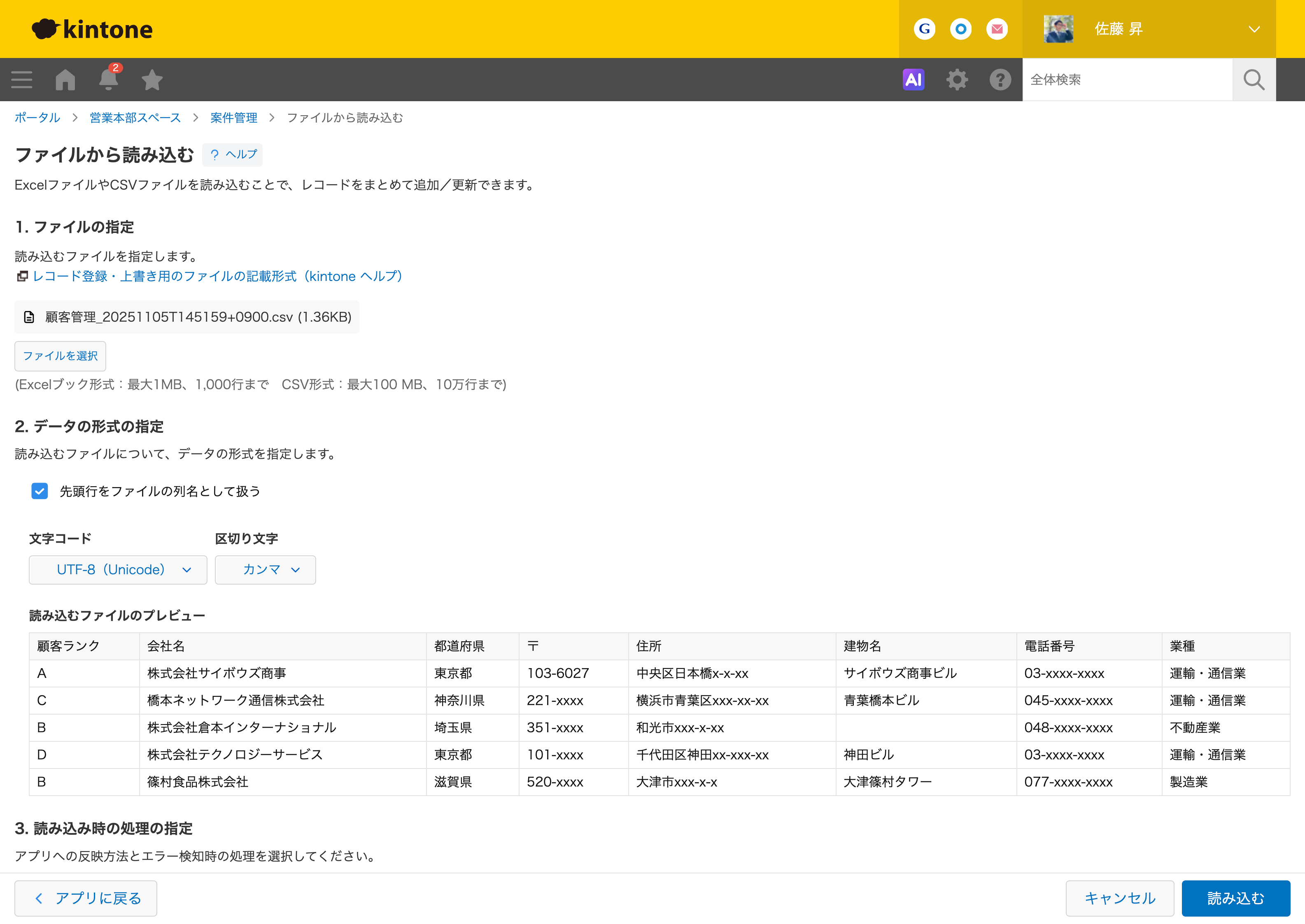 読み込み設定を保存する設定を有効にした上でファイル読み込みを行うことで、次回以降、列の並び順や項目名が同一構成のファイルを選択した際に、保存された読み込み設定が自動的に適用された状態から設定作業を行えるようになります。