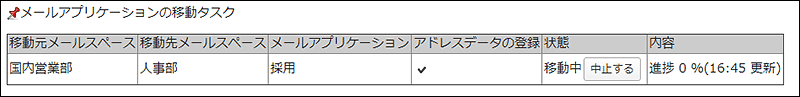 予約した移動処理は、「メールアプリケーションの移動」画面の「メールアプリケーションの移動タスク」セクションで確認できます。