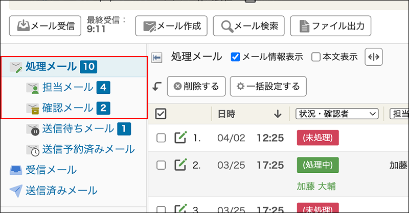 処理メールのうち、ログインしているユーザーが確認者として設定されているメールが表示されます。
