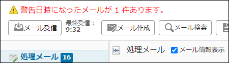 | 警告日時 | メール処理の警告日時を設定します。 設定した警告日時を過ぎてもメール情報の状況が「(処理済み)」でないメールがある場合、一覧画面に「警告日時になったメールがn件あります。」という警告メッセージが表示されます。 ![]() |