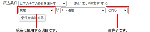 ドロップダウンリストから、絞込に使用する項目を選択します。 - 条件と演算子: