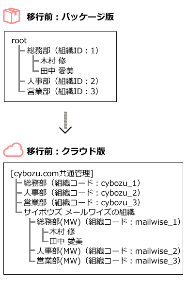 データを移行したあとにパッケージ版の組織名を変更した場合は、手動でcybozu.com共通管理の組織名を更新する必要があります。 - 組織に所属するユーザー: