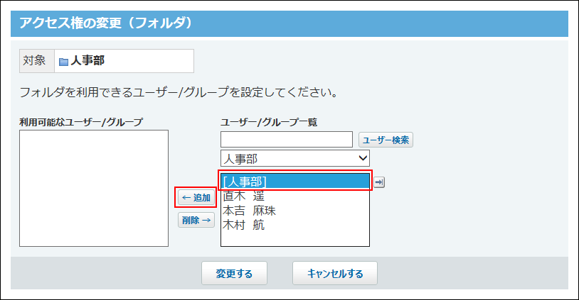 画面右側のドロップダウンリストから「人事部」を選択し、追加をクリックします。