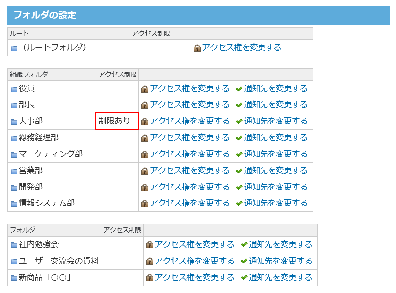 アクセス権を設定したフォルダは、「アクセス権の設定(フォルダ)」画面の「アクセス制限」欄に「制限あり」と表示されます。