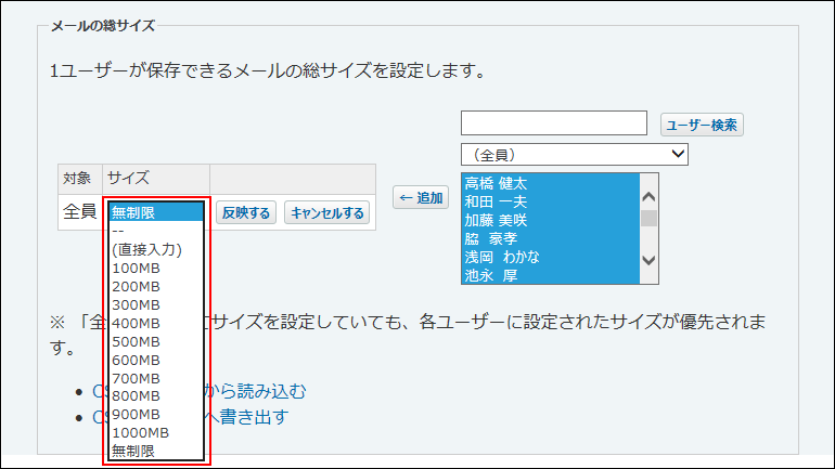 メールの総サイズの制限値の設定をCSVファイルから読み込んだり、CSVファイルに書き出したりできます。