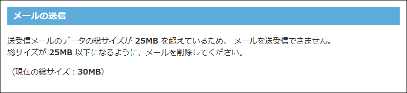 制限値を超えた状態で、メールを送受信しようとすると、ユーザーのメール画面に次のメッセージが表示されます。
