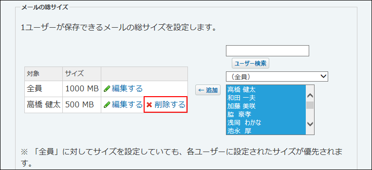 ユーザー単位で設定したメールの総サイズの制限値を削除します。全員の制限値は削除できません。