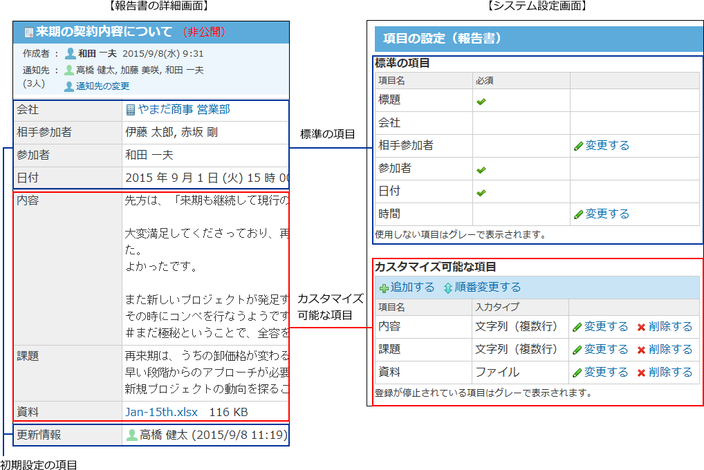 報告書のひな型には、情報を入力する「初期設定の項目」と「カスタマイズ可能な項目」を設定できます。