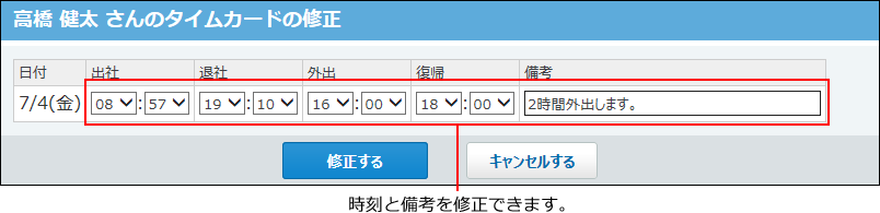 タイムカードの修正を禁止する場合は、「時刻の修正を許可する」から選択を外します。