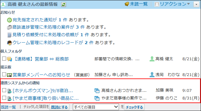 連携システムからの通知が有効の場合、連携先からの通知メールは、連携システムからの通知として処理されます。