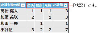 小計対象に「受注見込み日」と「商談項目」を設定した場合の例: