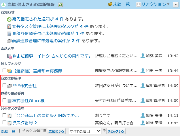 リマインダー通知は、トップページの「最新情報」パーツと未読一覧に表示されます。