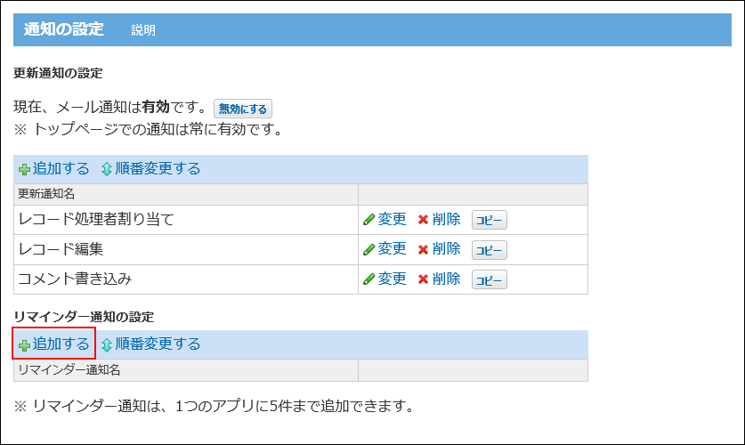 リマインダー通知が設定されているアプリは、システム設定のアプリの管理画面で確認できます。 - 1リマインダー通知につき500レコード